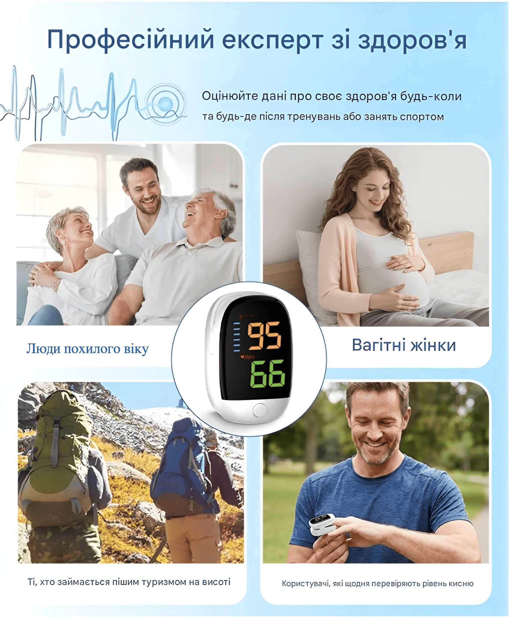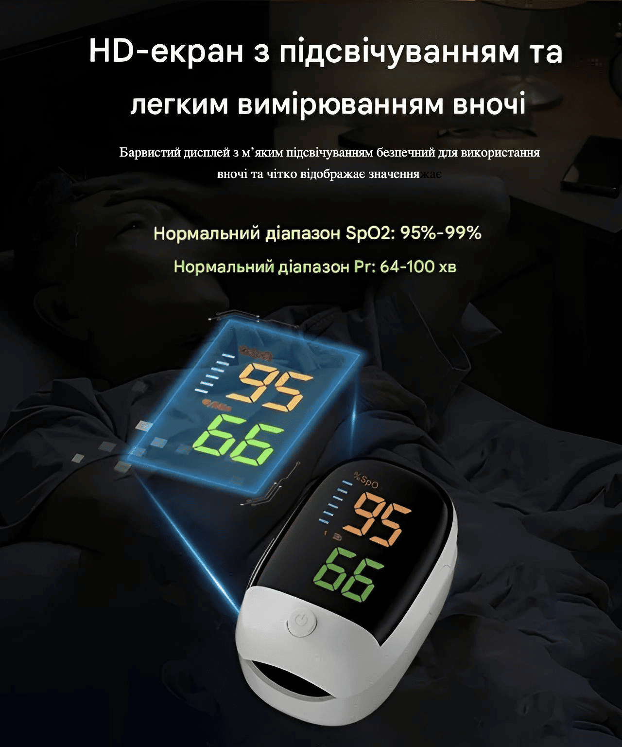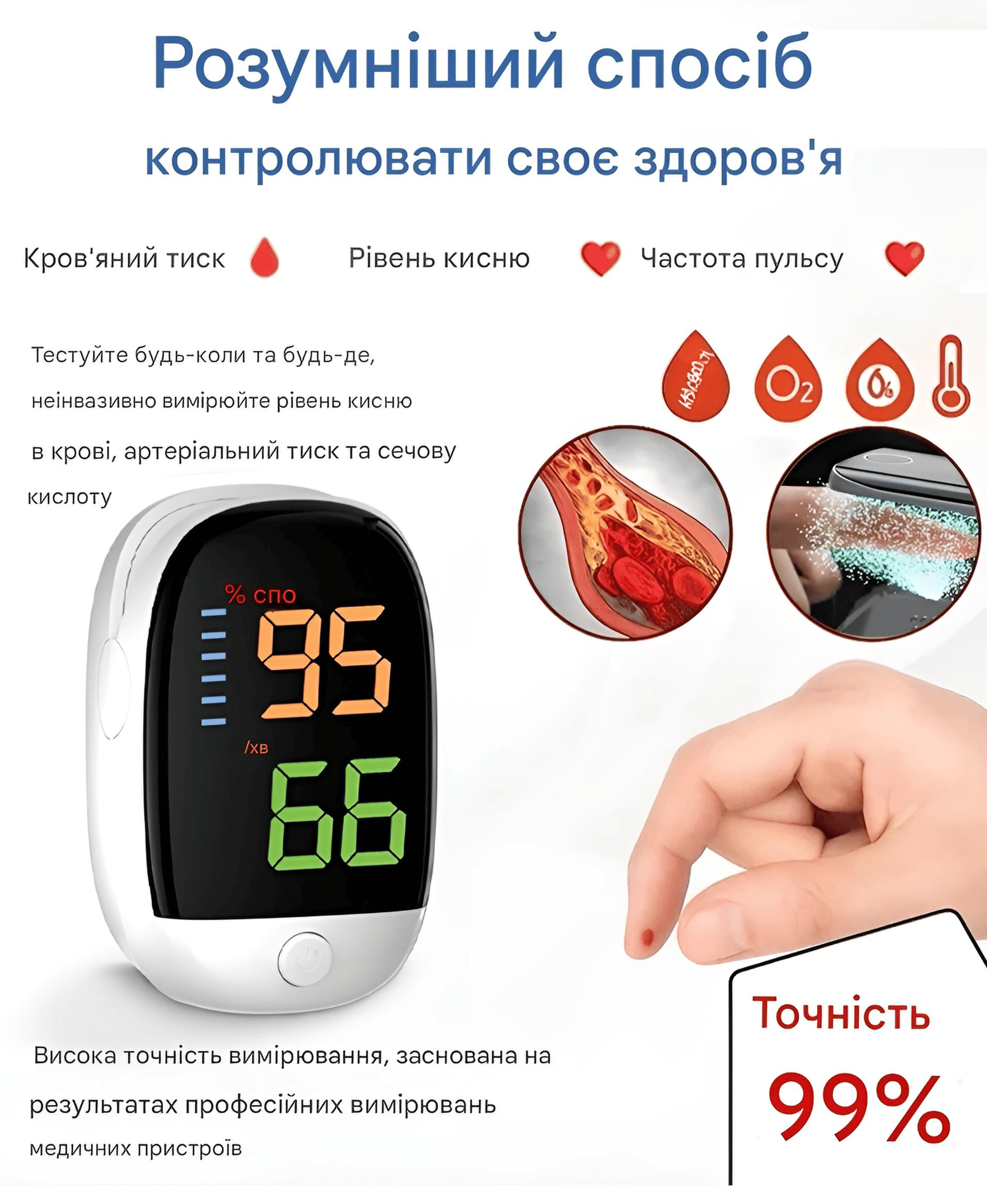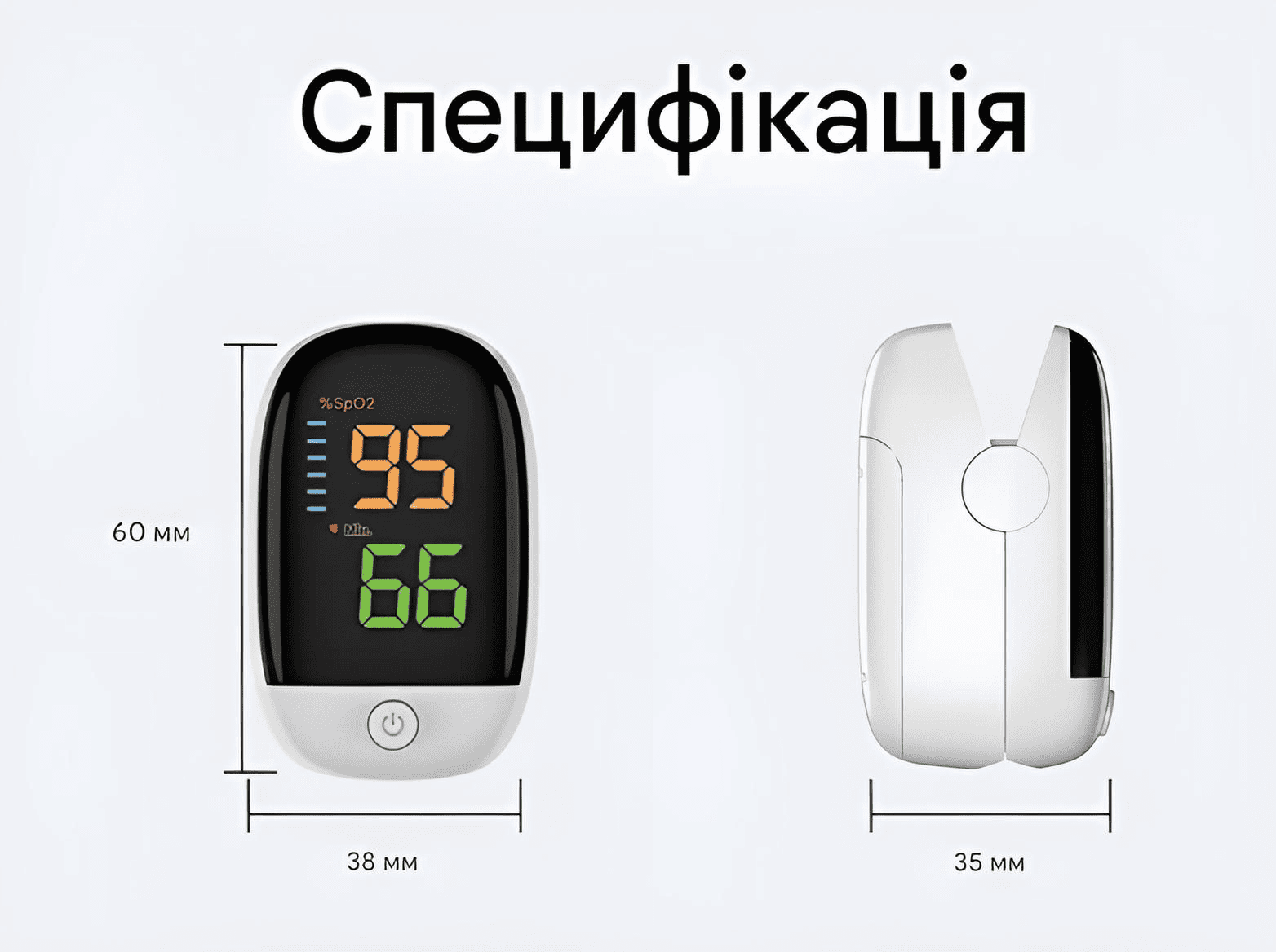 Чудово підходить для перевірки рівня кисню. Дисплей чітко відображає цифри, дуже просте керування однією кнопкою. Легкий та поміщається в кишені.