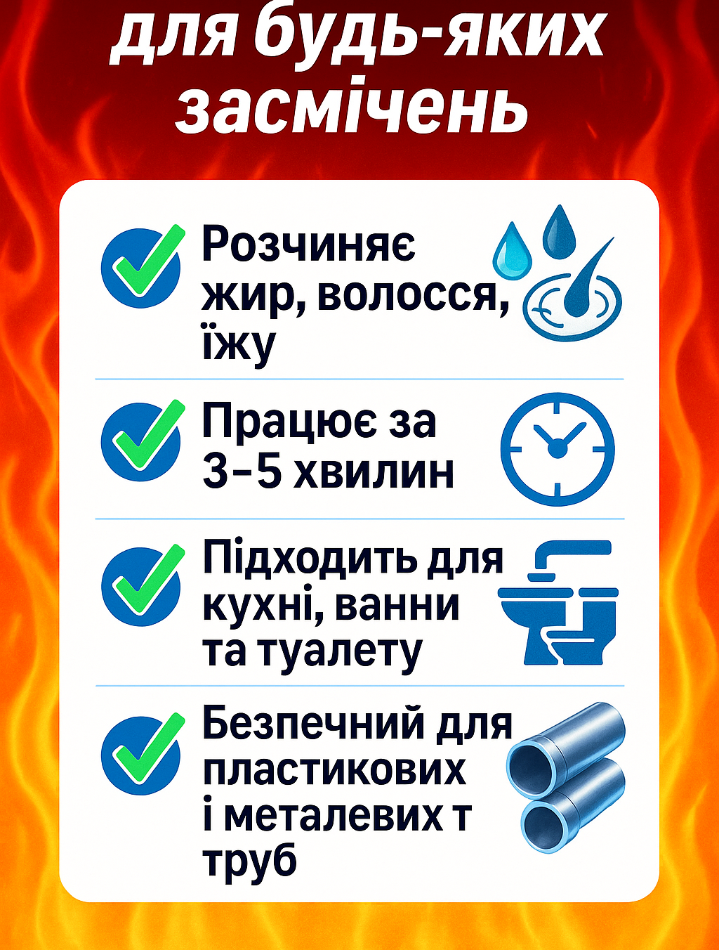 Засіб пробиває затор зсередини: реагенти моментально роз’їдають жир і бруд, перетворюючи їх у рідину. Жодного шансу навіть старим пробкам