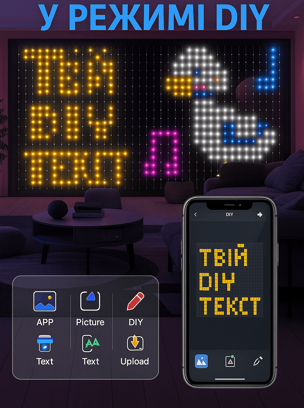 Перетвори свій інтер’єр на живий арт-простір. Розумна гірлянда створює унікальні анімації та наповнює кімнату магічним світлом.